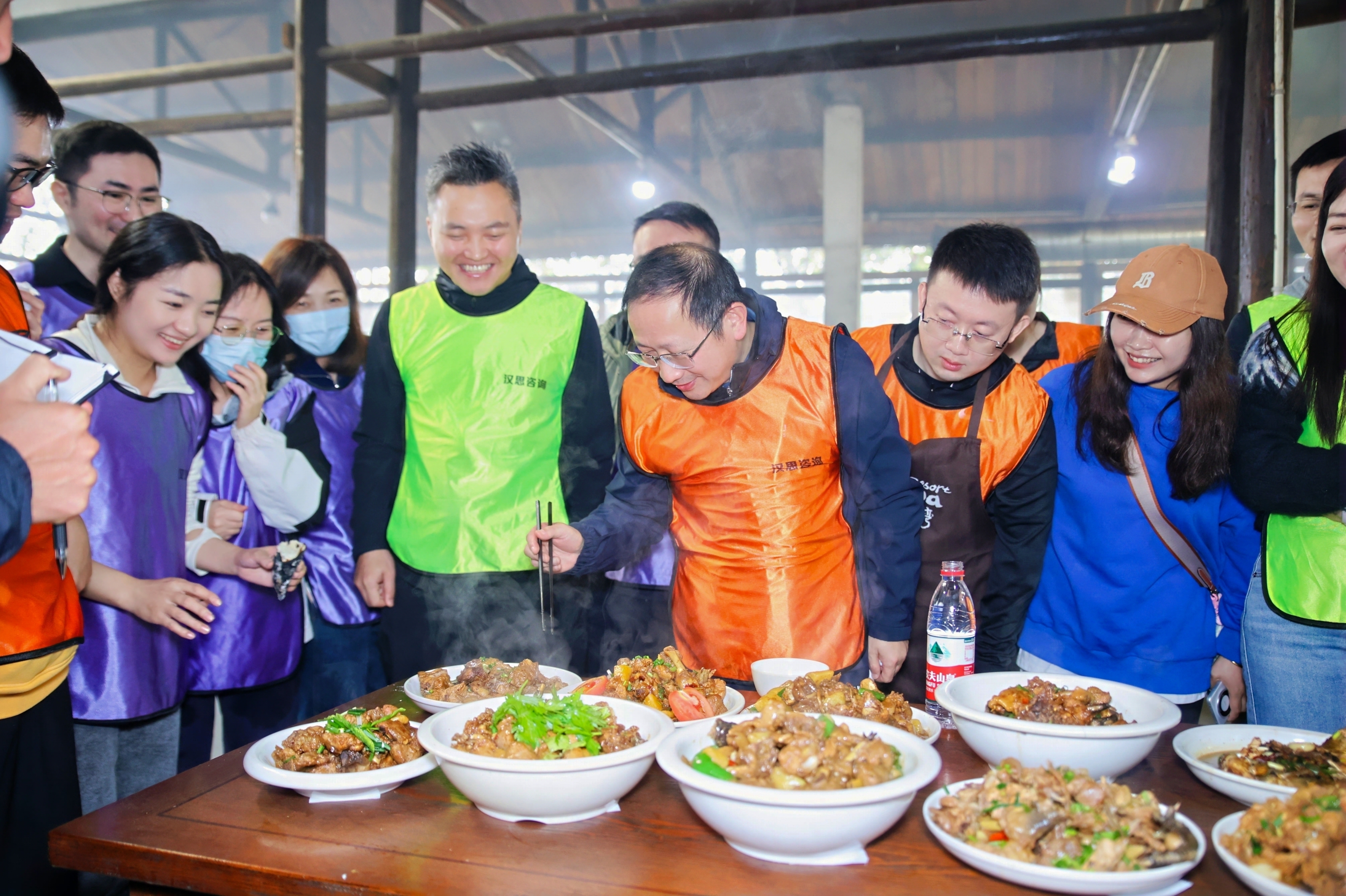 临近中午,10个大锅灶同时生火,“厨神争霸赛”正式开始。每组组内分工明确、各展所长,各组之间相互配合,你帮我煮饭、我帮你做菜,当各组的“拿手菜”端上桌、评委开始品尝打分时,气氛更是达到了高潮。在其乐融融的时光里,每个人都体会到了自己动手、共同努力带来的美味与幸福。